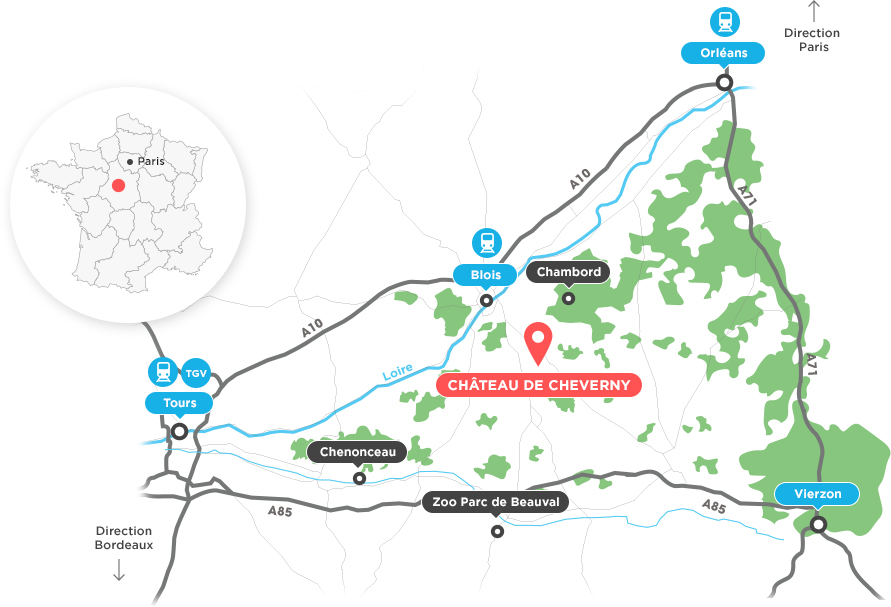 Depuis l'Europe, par avion, en train ou en voiture, le Château de Cheverny est à :
